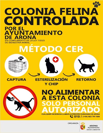 Nelle due zone sono stati collocati dei “rifugi” per gatti, sui quali è stata apposta la scritta ‘Colonia Felina controlada por el Ayuntamiento de Arona’, che illustra in dettaglio le fasi del Metodo CER e avverte che è vietato nutrire la colonia, in quanto sarà fatto solo da personale autorizzato.