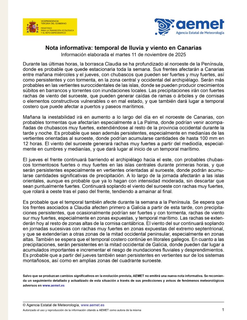 Le Isole Canarie entrano in allerta arancione per pioggia, temporali, vento e condizioni costiere avverse a causa dell’arrivo della tempesta Claudia.