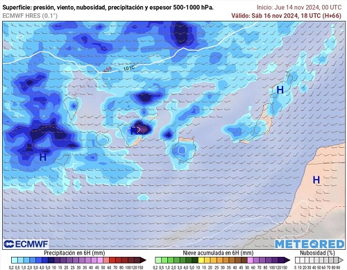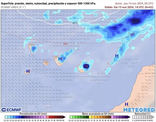 Il modello di previsione europeo (ECMWF) indica che le precipitazioni più abbondanti si terranno giovedì e saranno su La Palma, Tenerife e Gran Canaria, ma ci saranno rovesci nel sud e nel sud-est delle isole.